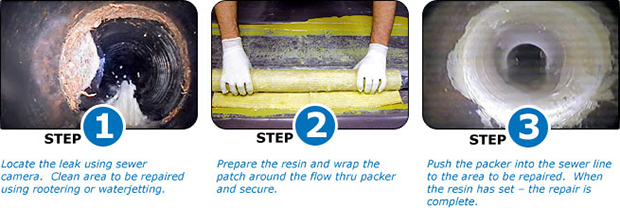 CIPP Cured-In-Place Point Trenchless Sewer Repair is a process where a liner is inserted into a pipe impregnated with a thermosetting resin, which is expanded and cured to form a tight-fitting liner within the host pipe, a pipe within a pipe. The CIPP process incorporates the existing pipeline into the finished product to produce improved performance of the original pipeline. Although cure times vary due to host pipe material and temperatures, PipePatch is typically cured in 1 to 3 hours.